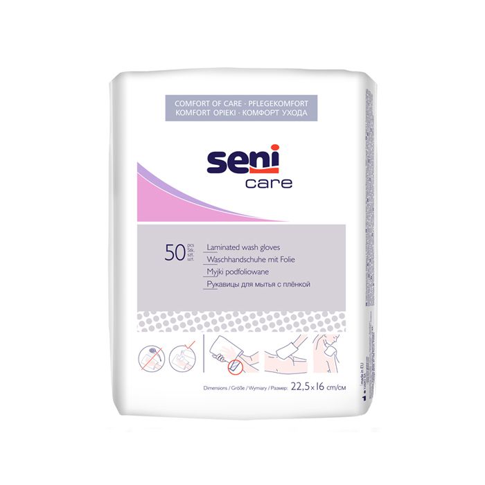 Рукавицы для мытья с водонепроницаемой пленкой Seni Care используются при очищении кожи больного вместе со специальными косметическими средствами.