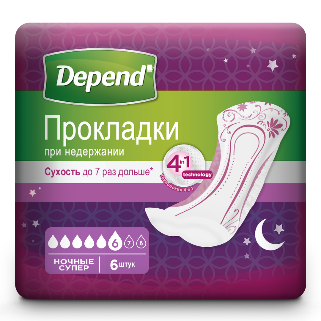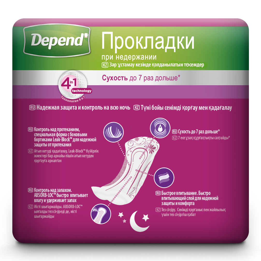 Удобные урологические прокладки Depend Super Night подойдут при высокой степени недержания мочи. Уникальная система «4 в 1» позволяет обеспечить максимальный комфорт. Жидкость не вытекает — этому препятствуют и хорошо впитывающий слой, и дополнительные надежные бортики. Специальная форма с боковыми бортиками Leak-Block (Лик-Блок) создана для максимальной защиты от протекания. Запах также нейтрализуется максимально быстро, а потому можно не переживать за этот деликатный момент. Прокладки Депенд Супер Найт довольно тонкие, что позволяет надевать их практически под любую одежду.